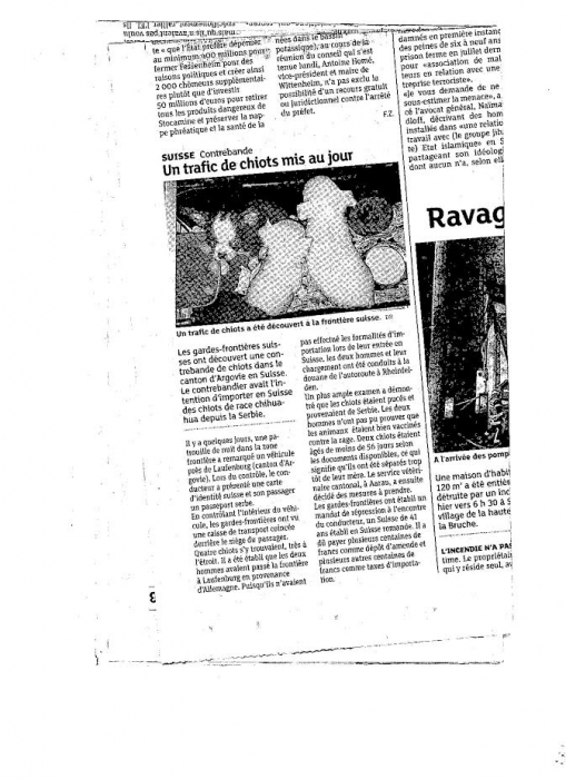 Les gardes frontières suisses ont découvert une contrebande de chiots dans le canton d'Argovie près de Laufenburg. Le contrebandier avait l'intention de revendre des chiots de race en provenance de Serbie.