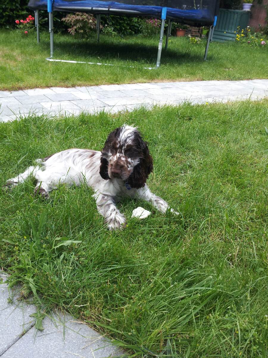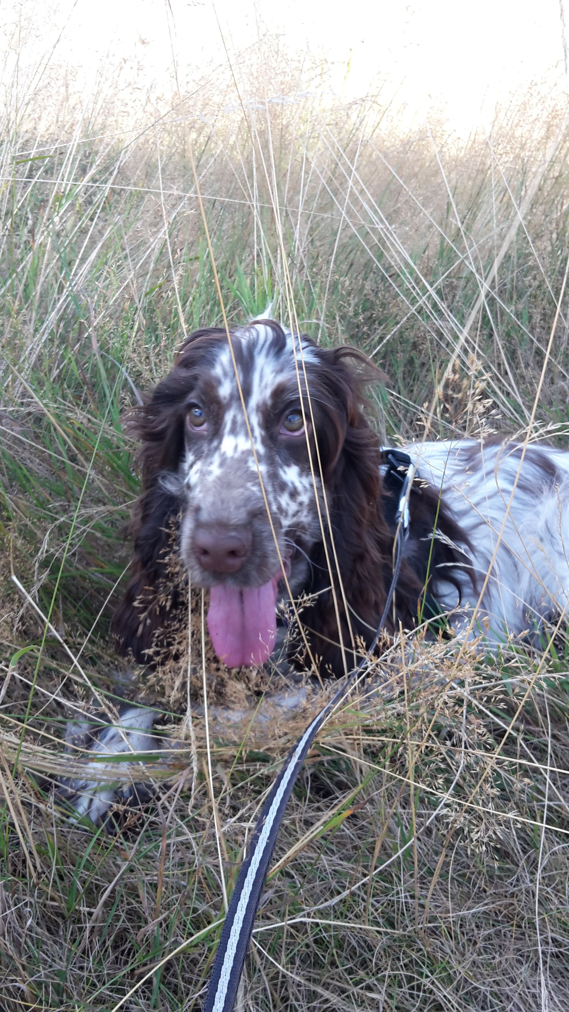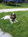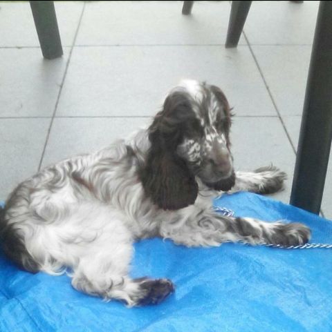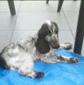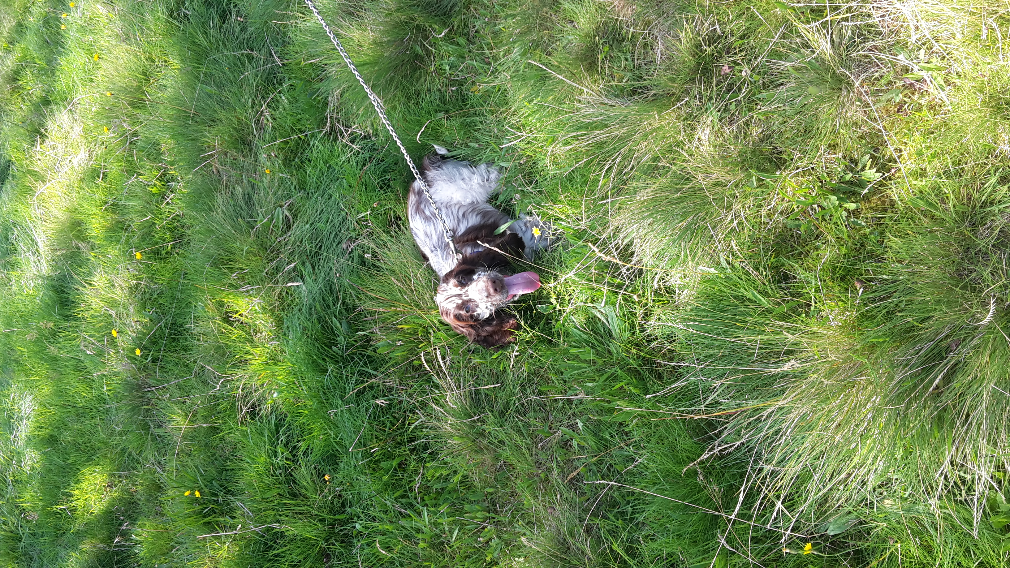 Moka toujours en pleine forme fait de belles peromenades avec ses maitres, malgrès la chaleur Moka reste dehors étendue sur la bache....