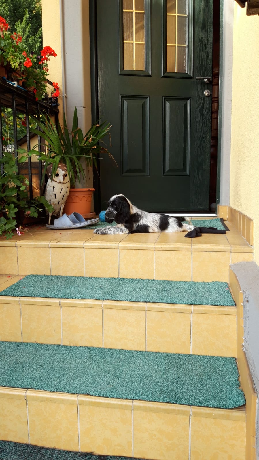 maintemant j'ai presque 9 mois. je connais à fond mon jardin, je fais la chasse aux crapauds, mes maîtres ont dû les attrapper et les faire déménager parce que je voulais m'amuser avec, j'ai bien failli m'empoisonner,
