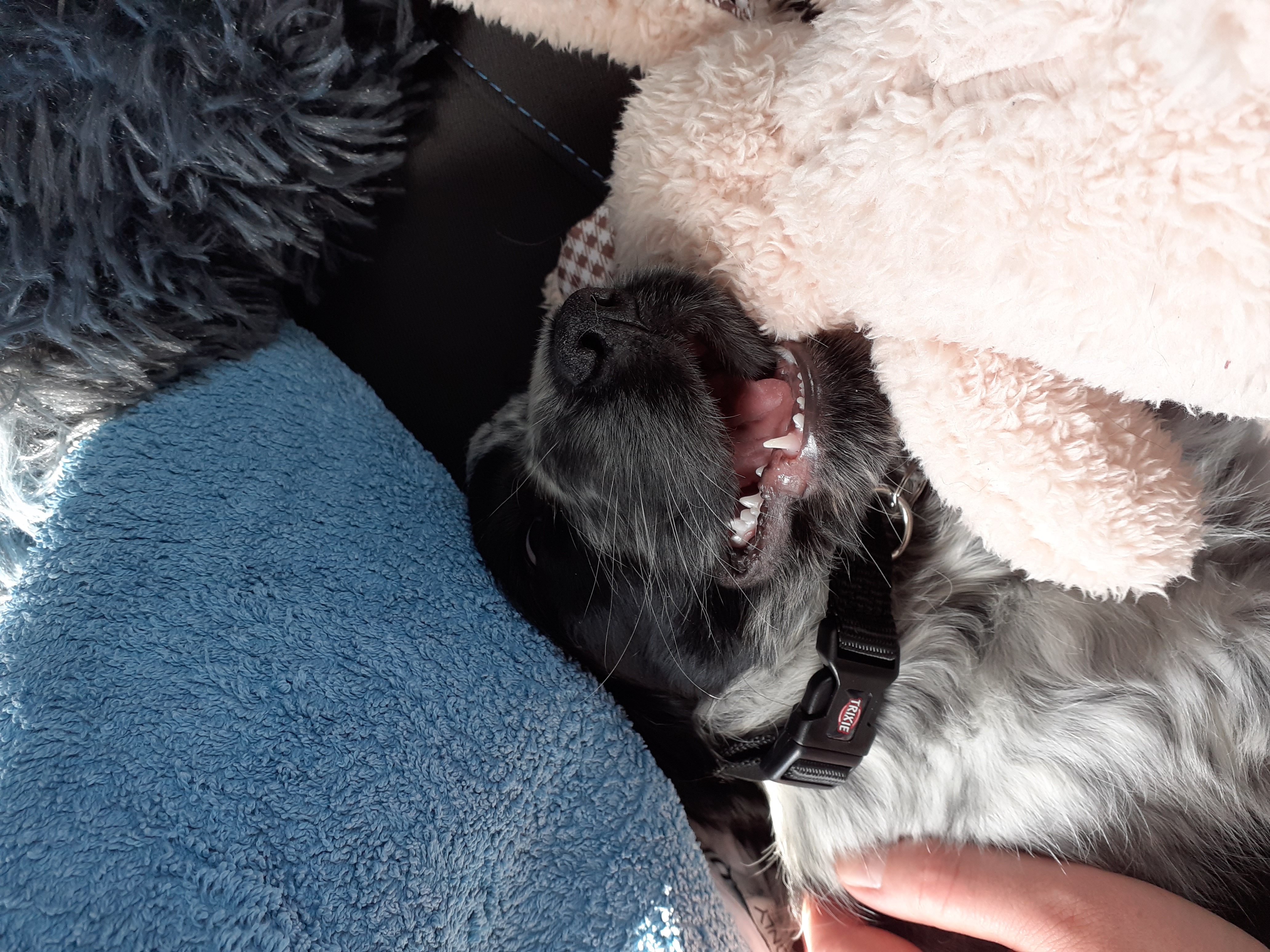 Scapin est bien arrivé à Chartres après un trajet de 7h30 durant lequel il s'est comporté de manière exemplaire (acceptation du collier et de la laisse, petit pipi sur l'aire d'autoroute, où il a pu rencontrer camions, voitures et autres engins à moteur) !