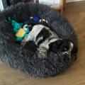 La première soirée s'est bien passée, il s'est très facilement approprié son nouvel environnement et semble bien à son aise. Il navigue de pièce en pièce et vit sa vie qu'il partage entre câlins, jeux et gros dodos, parfait équilibre entre démonstrations d'affection et indépendance. Il a bon appétit (il se montre très vocal au moment des repas) et fait ses gros besoins en extérieur.