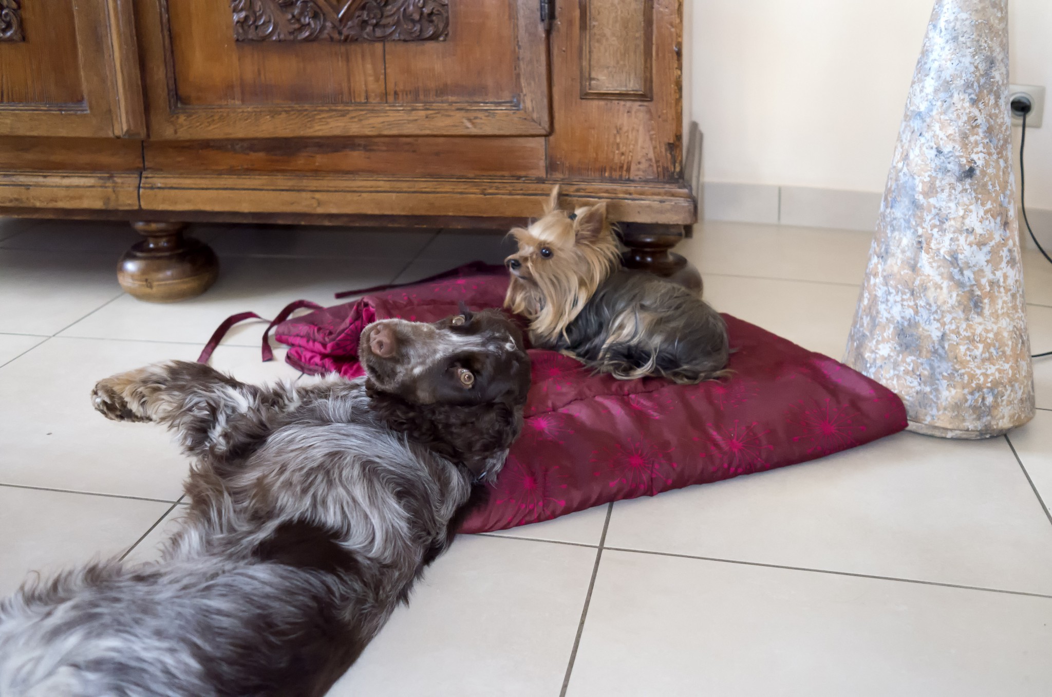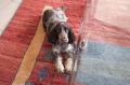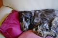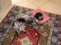 A présent, j'ai un an !!!! Je me sens très "chez moi" chez mes maîtres : bonne table, bon lit, promenades dès que le temps le permet, la vie de chateau, quoi .... Je suis une belle grande fille que toute la famille adore, surtout les petites-filles de mes maîtres avec lesquelles je m'éclate. J'ai un truc à moi : j'aime les petits oreillers, après avoir joué, lorsqu'un petit coup de pompe se fait sentir, je m'en trouve un, le prends dans ma gueule, le pose sur le tapis face à l'entrée, et repose ma tête dessus, c'est comme ça que font les "humains" !!!! - A cet endroit, il y a du soleil, là, je suis cool ....