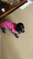 Avec la pluie de cette 1ère semaine, il a fallu l'équiper pour braver les intempéries de la région parisienne. Elle a donc déjà un imperméable, qu'elle a adopté sans rechigner, tout comme la laisse et le harnais. La fin des promenades est marquée par de grandes cavalcades dans le jardin, avec roulades et cache-cache.