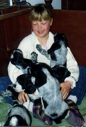 - Notre élevage se veut avant tout familial, c’est-à-dire sans chenil, box ou autre endroit susceptible d’enfermer et d’exclure les chiens, les chiots et leurs mères. Nos chiens vivent à l’image de ceux que possèdent les particuliers avec leur panier individuel, les promenades, le privilège de monter sur les canapés et bien évidemment l’affection et les caresses. Les jeunes chiots viennent au monde et grandissent à l’intérieur de la maison, sous surveillance constante et au contact de nos enfants, point très important pour la sociabilisation et l’apprentissage de leur vie future. Un chien provenant d’un élevage familial est préparé à une vie avec les hommes ; il n’est pas névrosé et donc plus facile à éduquer. Nous minimisons ainsi les stress liés à l’élevage intensif en chenil comme le manque de contact humain ou celui de la mère jusqu’au terme du sevrage et relativisons de ce fait la loi du plus fort (chiots se faisant "rosser ", mangeant moins ou craintifs). Le chiot fait l’apprentissage de la socialisation entre la 6ème et la 8ème semaine or certains chenils n’hésitent pas à les vendre pendant cette période déterminante et à les expédier à des animaleries. Les traumatismes et le stress sont accrus par les expéditions tous azimuts sans soins et sans lumière. Un manque de sérieux, des saillies consanguines ou plus prosaïquement l’appât du gain peuvent également engendrer des animaux névrosés. Pour illustrer cette allégation, nous avons été obligés de déplacer le parc avec des chiots âgés de 6 semaines de 5 mètres dans une pièce contiguë (du salon à la salle à manger) et malgré la présence de leur mère, ceux-ci ont réagi au stress de la situation par une diarrhée. Chaque chien, compte tenu de son caractère et de sa sensibilité, demande plus ou moins d’affection et d’attention et ne doit en aucun cas être parqué comme du bétail. En conclusion, nous sommes des passionnés de cockers anglais et nous nous investissons au maximum afin de donner les meilleures chances d’adaptation au chiot et à son maître potentiel.